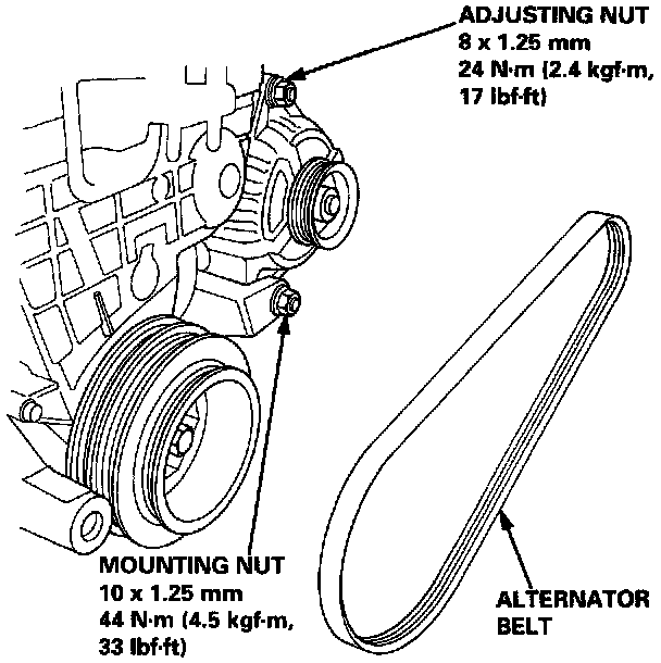 4. Loosen the adjusting nut and mounting nut, then remove the alternator belt.