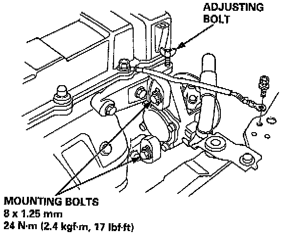 4. Loosen the adjusting nut and mounting nut, then remove the alternator belt.