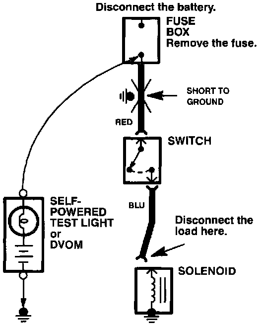 5. If the self-powered test light goes on or the DVOM displays a low reading or no reading (ZERO), there is a short to ground in the wiring near that point.