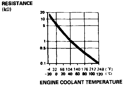 The ECT Sensor is a temperature dependant resistor (thermistor). The resistance of the thermistor decreases as the engine coolant temperature increases as shown above.