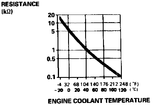The ECT Sensor is a temperature dependant resistor (thermistor). The resistance of the thermistor decreases as the engine coolant temperature increases as shown above.