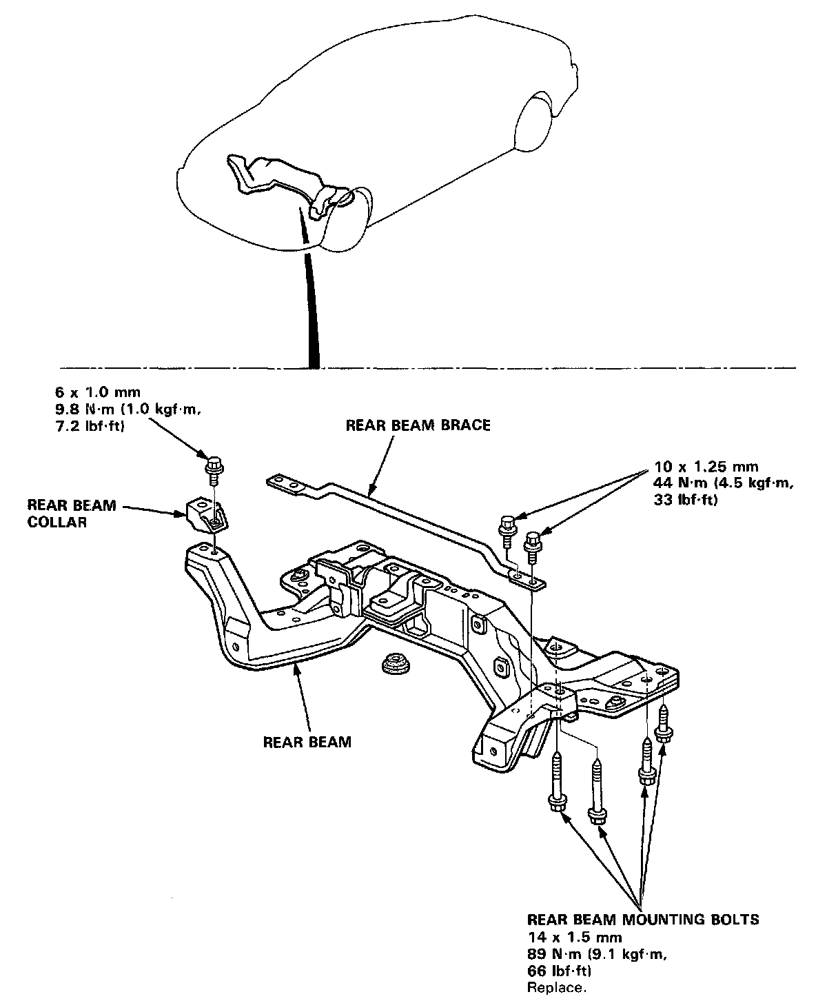 CAUTION: After loosening the rear beam mounting bolts, be sure to replace them with new ones.
