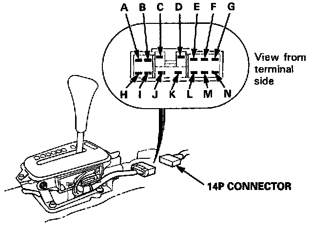 A/T GEAR POSITION SWITCH / TEST1. Remove the console, then disconnect the 14-P connector from the switch.