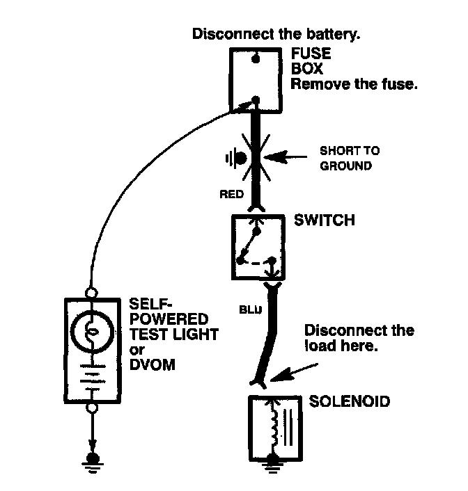 5. If the self-powered test light goes on or the DVOM displays a low reading or no reading (zero), there is a short to ground in the wiring near that point.