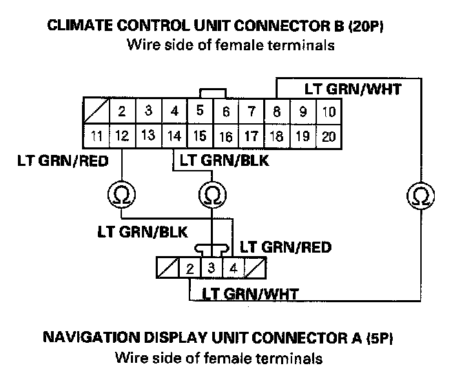 3. Check for continuity between the following terminals of the climate control unit connector B (20P) and navigation display unit connector A (5P).