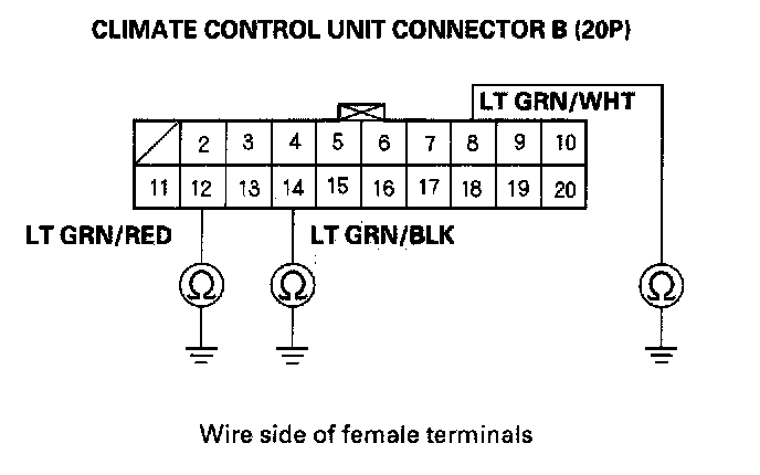 4. Check for continuity between the body ground and climate control unit connector B (20P) terminals No. 8, 12 and 14 individually.