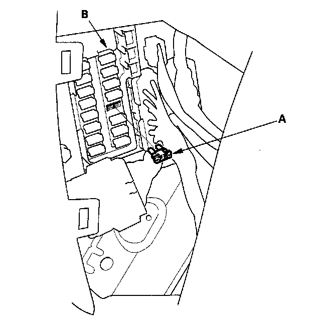 - Turn the ignition switch OFF, and remove the No.13 CLOCK BACKUP fuse (7.5A) (A) from the passenger's under-dash fuse/relay box (B) for 10 seconds.