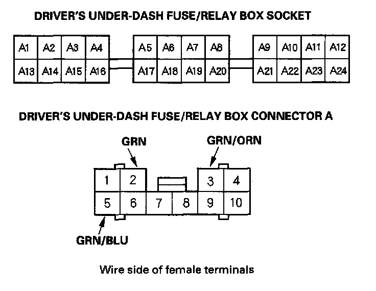 4. With the driver's [1][2]multiplex control unit still disconnected, make these input tests at the driver's under-dash fuse/relay box socket.