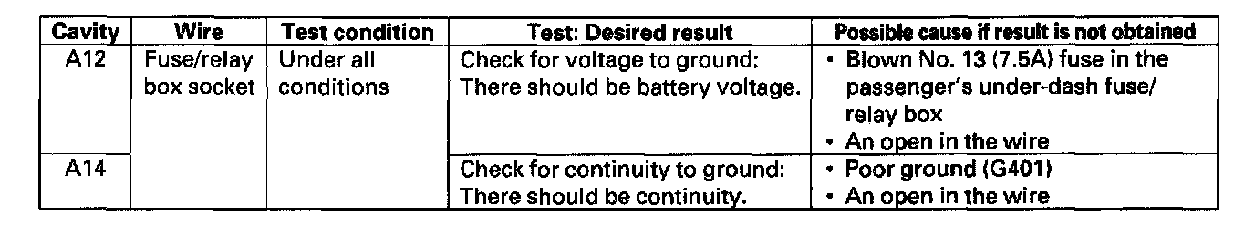 8. With the passenger's [1][2]multiplex control unit still disconnected, make these input tests at the passenger's under-dash fuse/relay box socket.