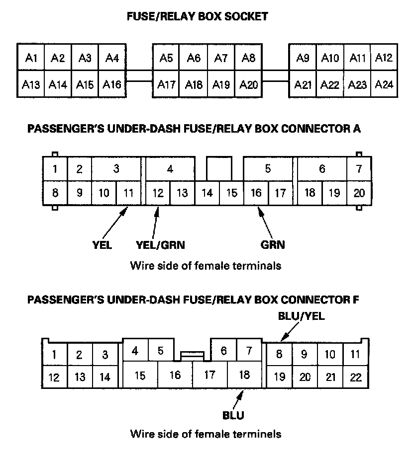 9. Reconnect the passenger's [1][2]multiplex control unit to the passenger's under-dash fuse/relay box, and perform the following input tests at the appropriate connectors on the passenger's under-dash fuse/relay box. For passenger's under-dash fuse/relay box connector socket location.