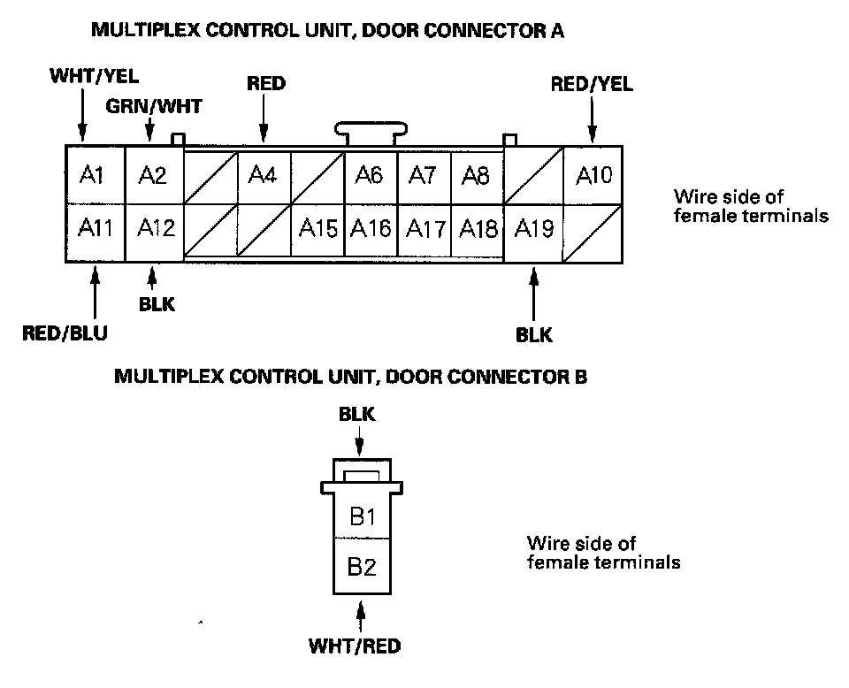 12. With the door [1][2]multiplex control unit still disconnected, make these input tests at the connectors.