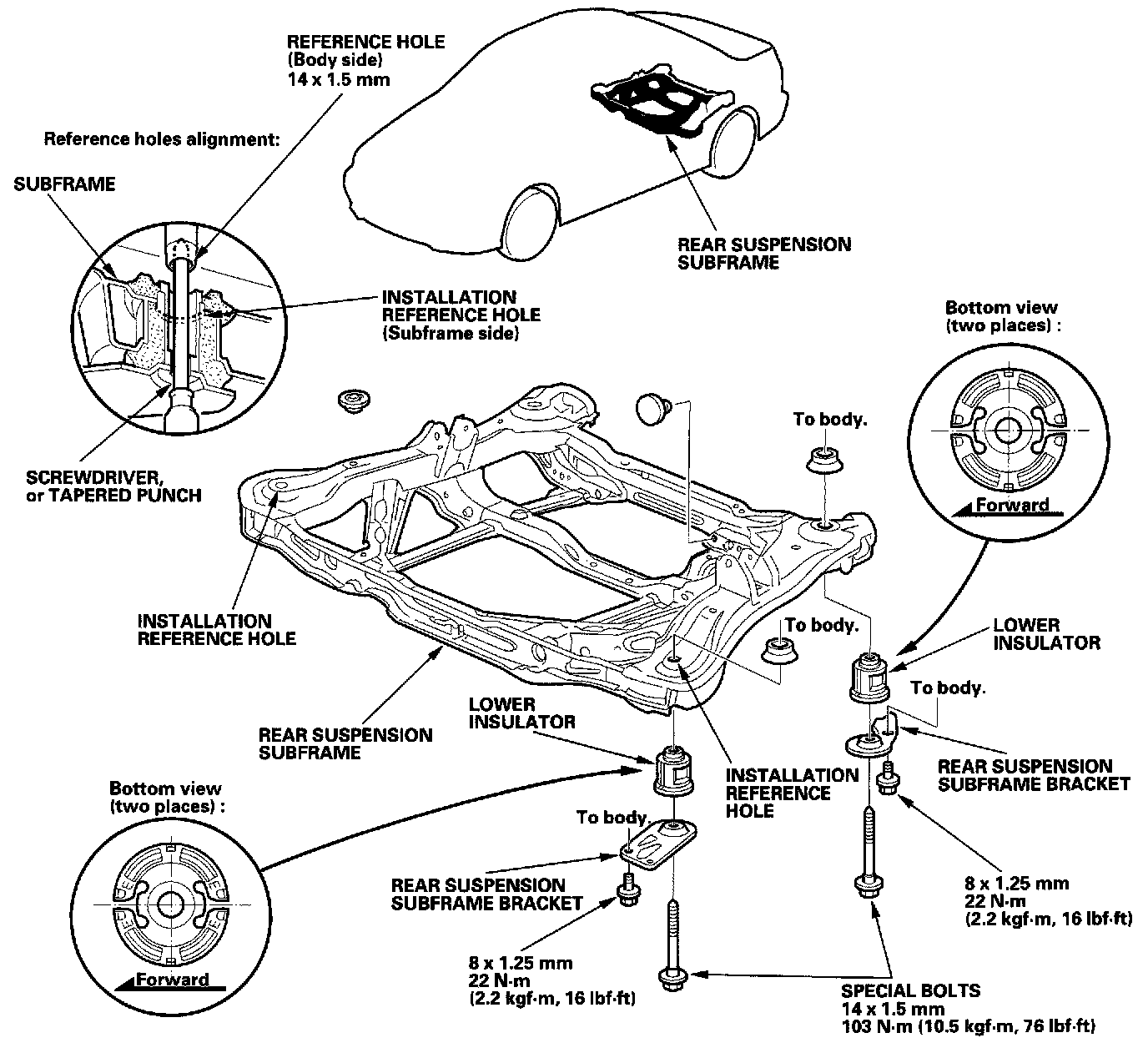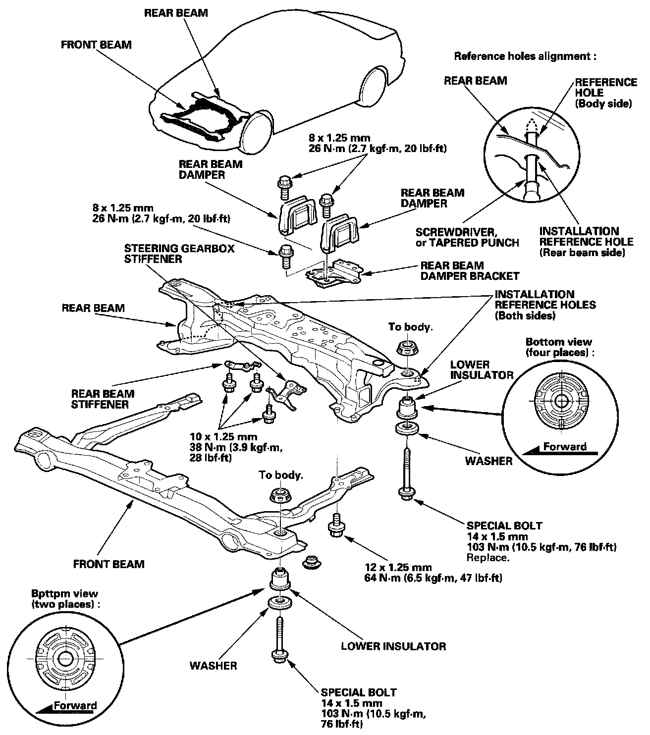 After loosening the subframe mounting bolts, be sure to replace them with new ones.