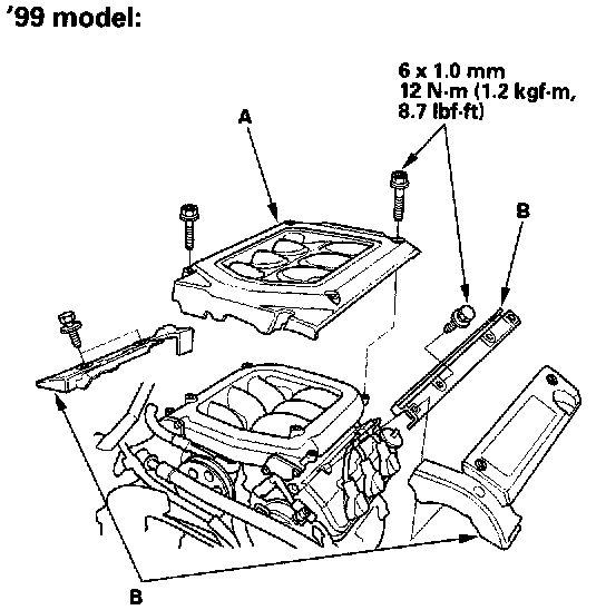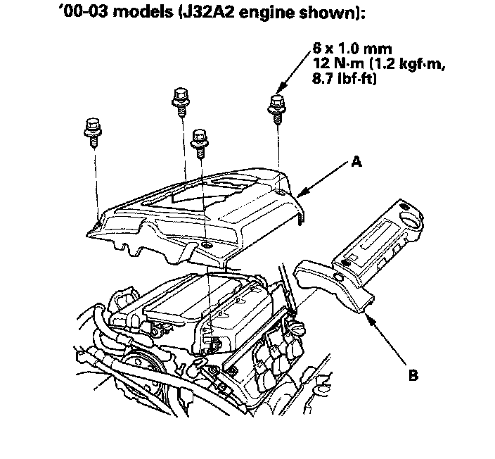 5. Remove the intake manifold cover (A) and ignition coil cover(s) (B).