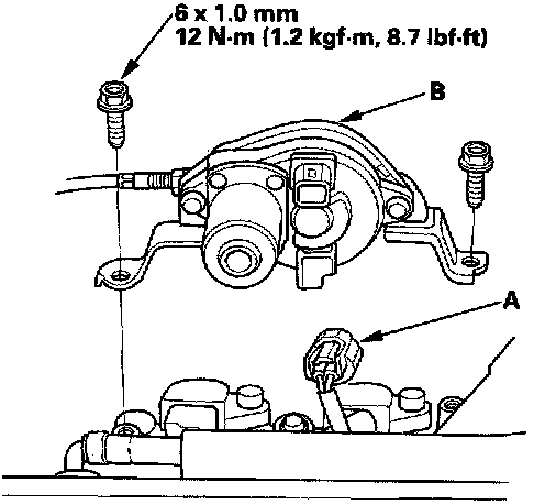 6. Disconnect the Intake Manifold Runner Control (IMRC) actuator connector (A), then remove the IMRC actuator (B) (J32A2 engine).