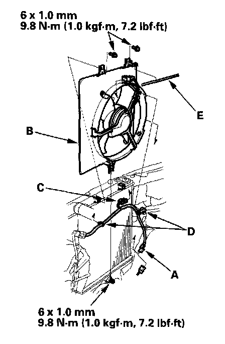 6. Remove the compressor clutch connector (A) from the condenser fan shroud (B), then disconnect the compressor clutch connector. Disconnect the condenser fan connector (C), then remove the wire harness clips (D) from the condenser fan shroud. Remove the cruise control actuator cable (E) from the clamp. Loosen the lower mounting bolt, then remove the upper mounting bolts and the condenser fan shroud. Be careful not to damage the radiator fins when removing the condenser fan shroud.