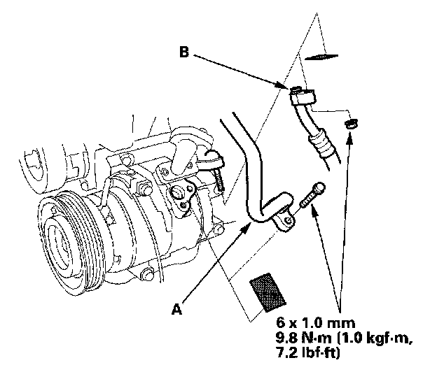 7. Remove the bolt and the nut, then disconnect the suction line (A) and discharge line (B) from the compressor. Plug or cap the lines immediately after disconnecting them to avoid moisture and dust contamination.