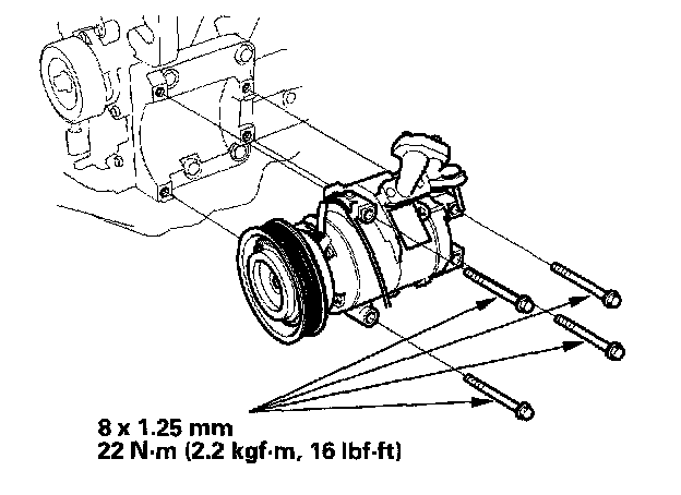 8. Remove the mounting bolts and the compressor. Be careful not to damage the radiator fins when removing the compressor.