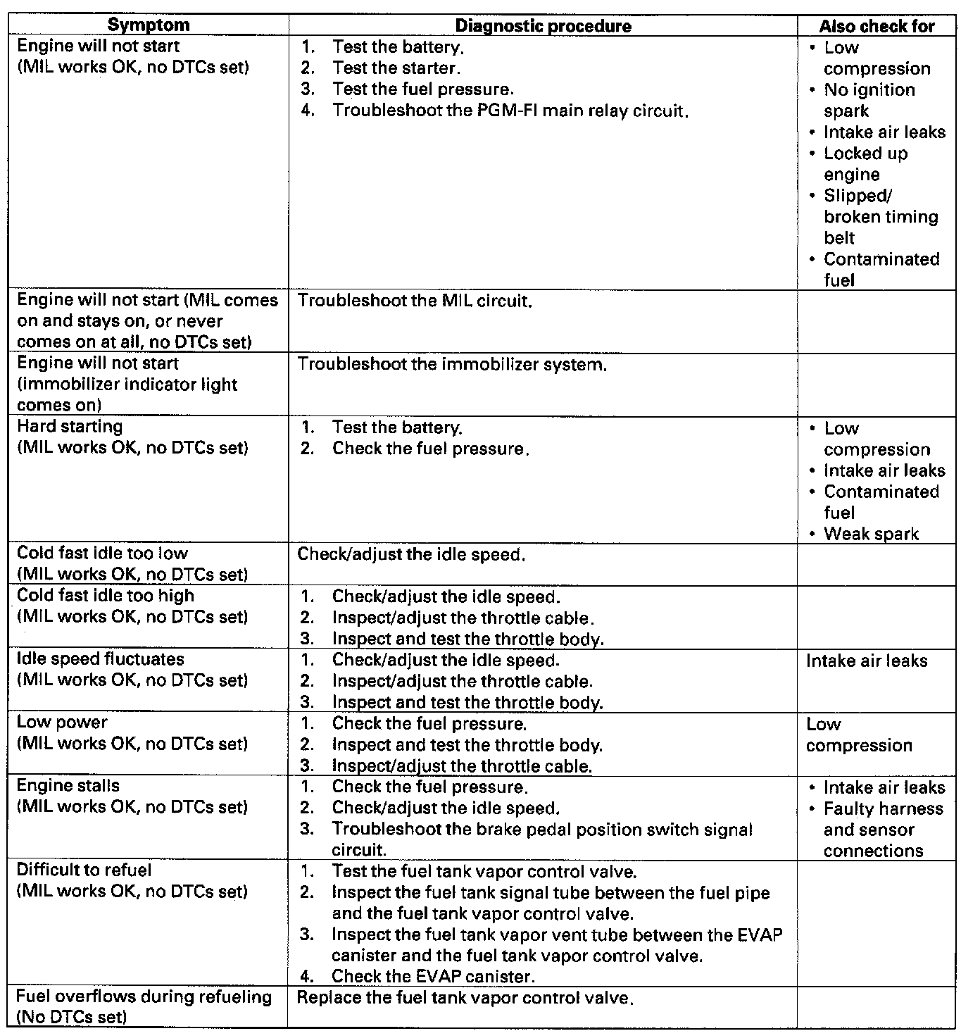 These symptoms DO NOT trigger Diagnostic Trouble codes (DTCs) and cause the Malfunction Indicator Lamp (MIL) to come on. If the MIL is reported on, check for DTCs. If the vehicle has one of these symptoms, do the diagnostic procedure for it, in the sequence listed, until you find the cause.