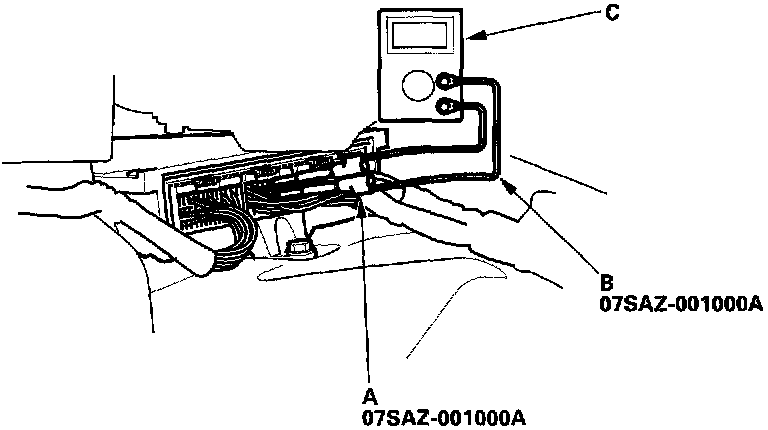 3. Connect the backprobe adapters (A) to the stacking patch cords (B), and connect the cords to a multimeter (C). Using the wire insulation as a guide for the contoured tip of the backprobe adapter, gently slide the tip into the connector from the wire side until it comes in contact with the terminal end of the wire.