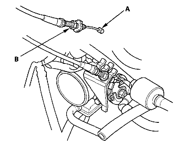 2. K20A2, K20Z1 engines: Fully open the cruise control link by hand, then remove the cruise control cable (A) from the link. Loosen the locknut (B), and remove the cable from the bracket.
