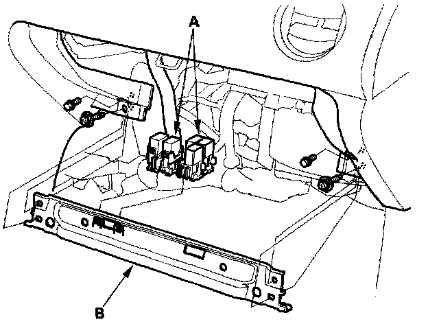 3. Remove the relays (A), then remove the bolts and the glove box frame (B).