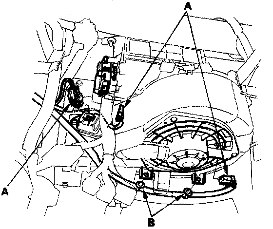 5. Disconnect the connectors (A) from the blower motor, the power transistor, and the recirculation control motor, then remove the wire harness clips (B).