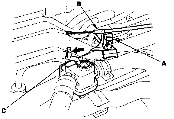 7. From under the hood, open the cable clamp (A), then disconnect the theater valve cable (B) from the heater valve arm (C). Turn the heater valve arm to the fully opened position as shown.