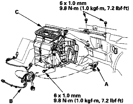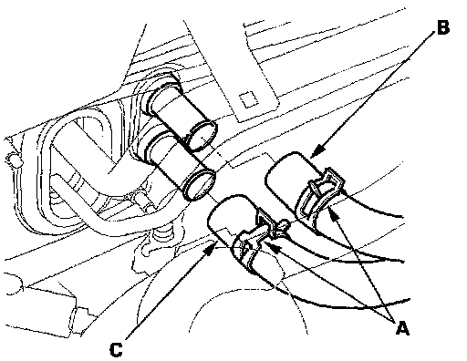 9. Slide the hose clamps (A) back, then disconnect the inlet heater hose (B) and the outlet heater hose (C) from the heater core. Engine coolant will run out when the hoses are disconnected; drain it into a clean drip pan. Be sure not to let coolant spill on the electrical parts or the painted surfaces. If any coolant spills, rinse it off immediately.