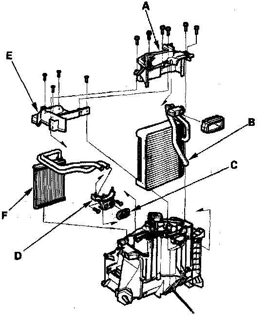 15. Remove the self-tapping screws and the expansion valve cover (A). Carefully pull out the evaporator core (B) so you don't bend the inlet and outlet pipes. Remove the grommet (C),then remove the self-tapping screws and the flange cover (D). Remove the self-tapping screws and the pipe cover (E), then carefully pull out the heater core (F) so you don't bend the inlet and outlet pipes.