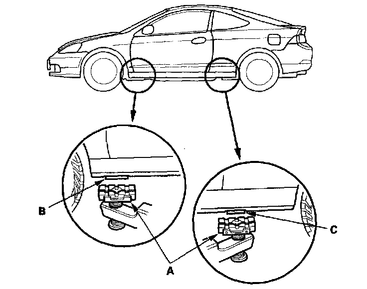 1. Position the hoist lift blocks (A), on safety stands, under the vehicle's front support points (B) and rear support points (C).