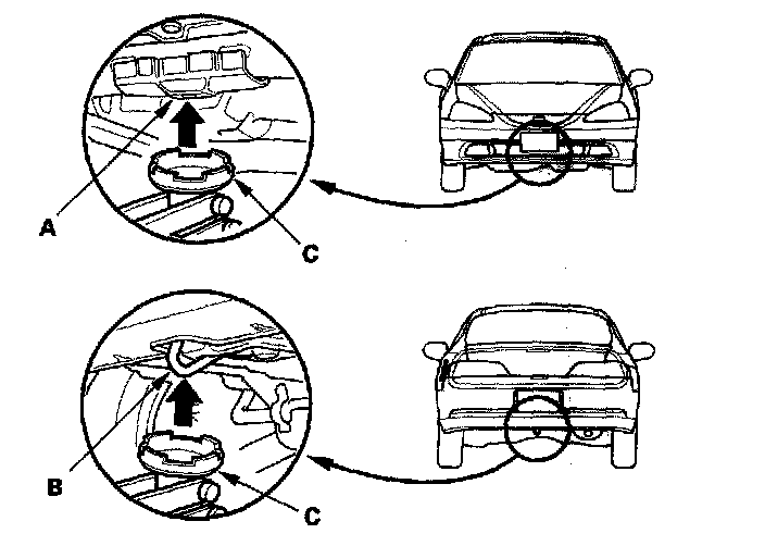 4. Position the floor jack under the front jacking bracket (A) or rear jacking bracket (B), center the jacking bracket in the jack lift platform (C),and jack up the vehicle high enough to fit the safety stands under it.