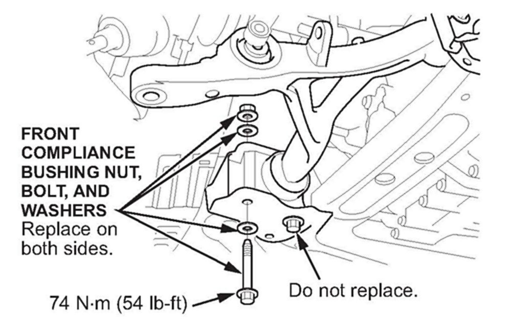 In late November 2008, dealers that sold affected vehicles or had them in inventory received enough front compliance bushing bolts, nuts, and washers to repair all sold and unsold vehicles. For reference, here are the part names and numbers: