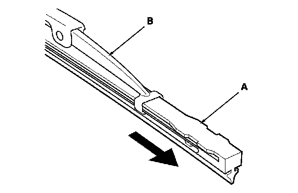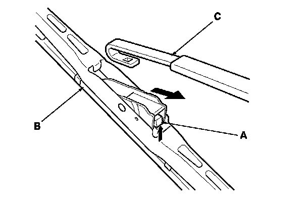 2. Press and hold the tab (A) and slide the wiper blade (B) toward the tab to release it from the wiper arm (C).