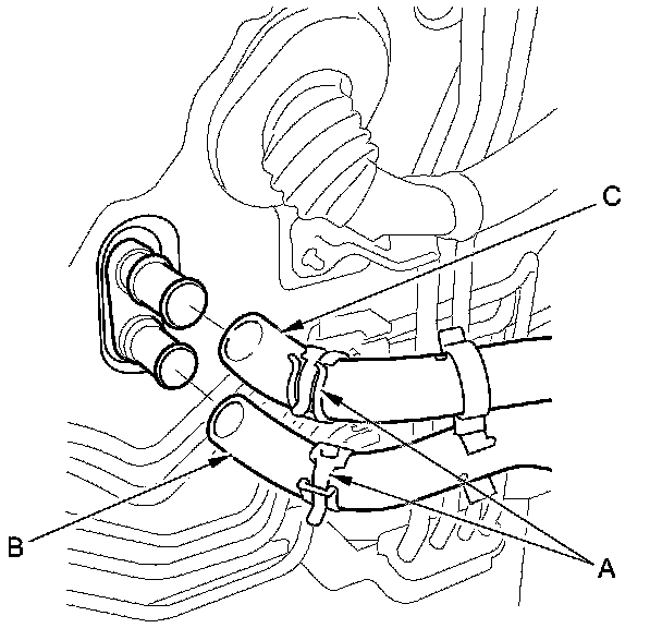 5. From under the hood, slide the hose clamps (A) back. Disconnect the inlet heater hose (B) and the outlet heater hose (C) from the heater unit. Note the layout of the hoses.