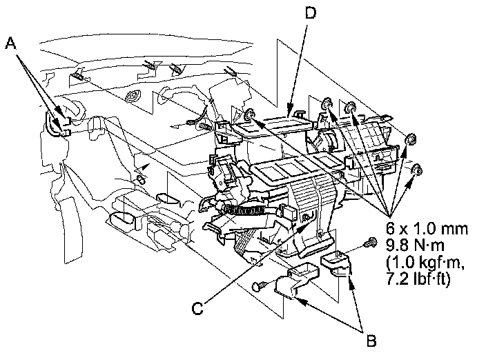 12. Disconnect these connectors (A): the driver's air mix control motor, the driver's mode control motor, and evaporator temperature sensor. Detach the harness clips (B), and remove the wire harness (C).