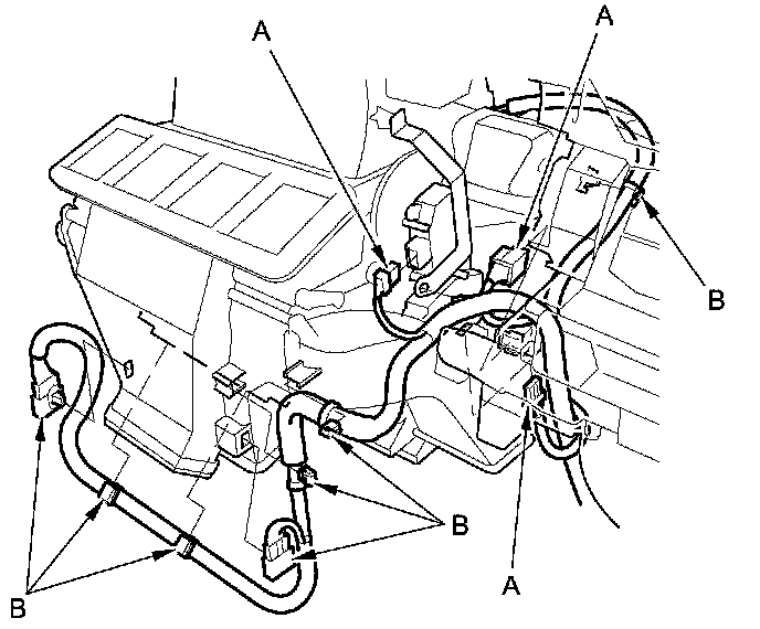 9. Disconnect the connector (A) from the blower motor. Detach the wire harness clips (B).