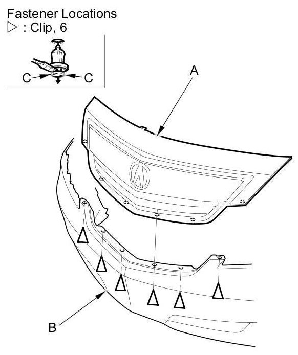 2. Detach the clips, then remove the front grille (A) from the front bumper (B).