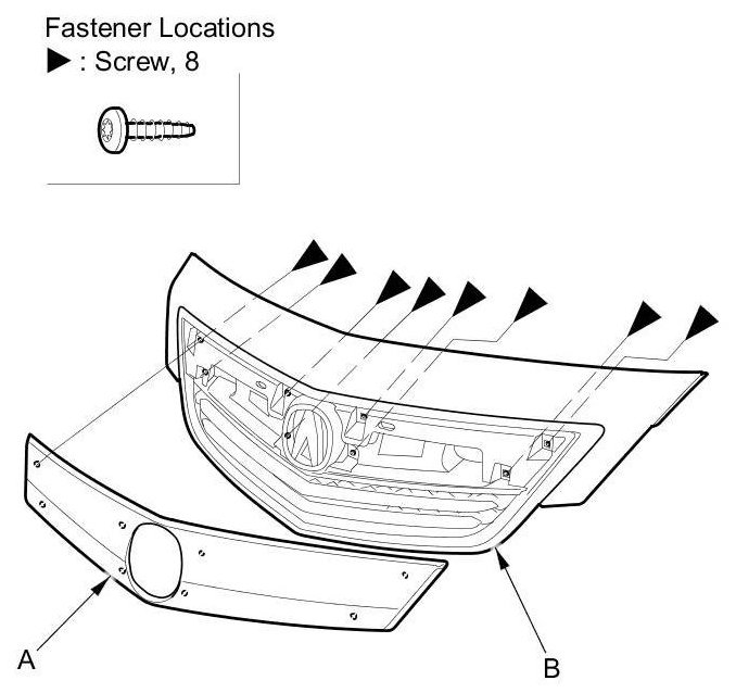 2. From behind the grille, remove the TORX screws, then remove the front grille emblem base (A) from the front grille base (B).