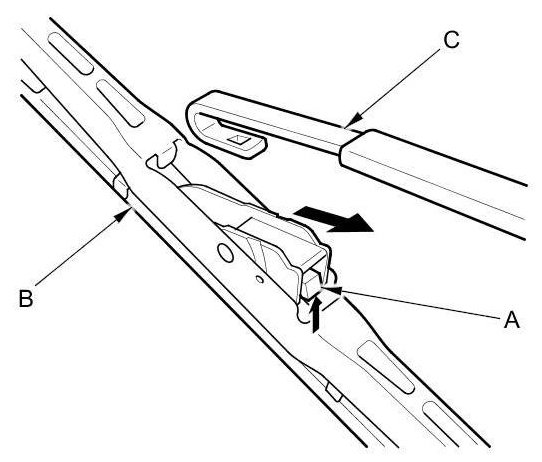 2. Press and hold the tab (A) and slide the wiper blade assembly (B) toward the tab to release it from the wiper arm (C).