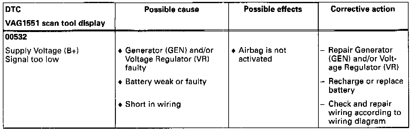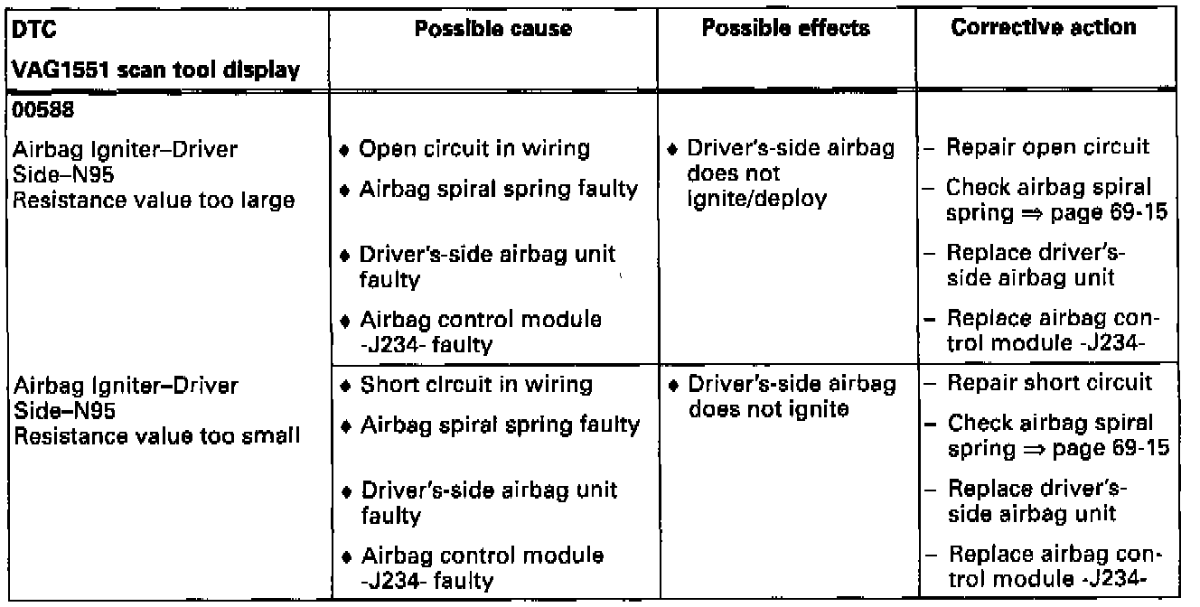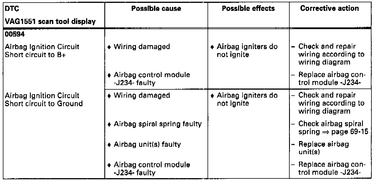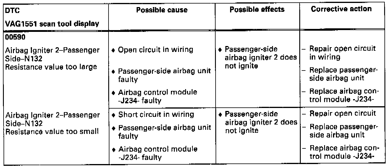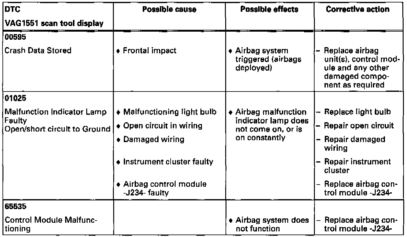 - The table lists possible airbag system malfunctions that can be recognized by the airbag control module -J234-. Each of these malfunctions is stored as a Diagnostic Trouble Code (DTC) in the airbag control module's DTC memory, and can be checked using the VAG1551 scan tool.- If malfunctions occur sporadically, or if DTC memory was not erased after correcting malfunctions, these malfunctions will be recognized as sporadic malfunctions, displayed with "/SP" on the right side of the VAG1551 scan tool display.