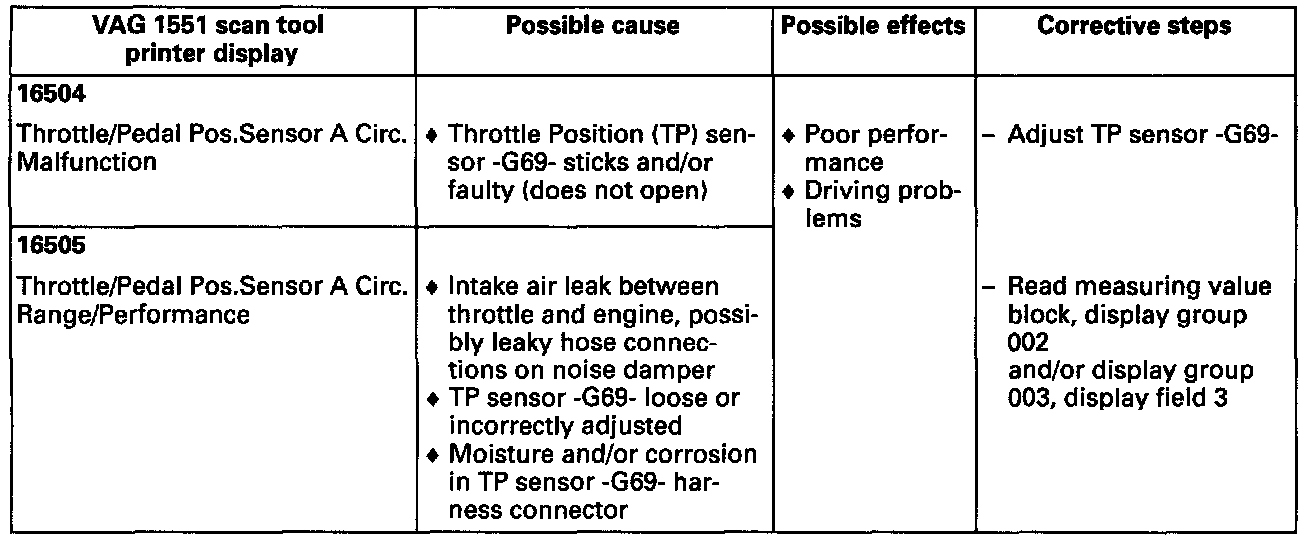 ^ The DTC "16504" is stored as soon as a TP sensor signal voltage of over 0.72 volts (corresponds to a throttle opening of more than 7°) is recognized for longer than 1 second with Closed Throttle Position switch (CTP) closed.