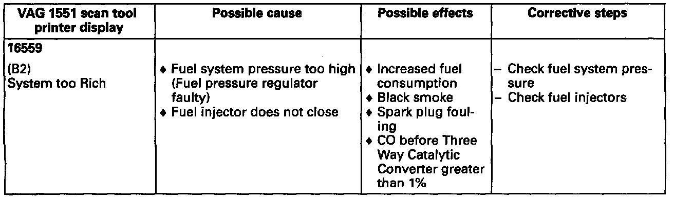If DTC "16559" is stored, the oxygen sensor control has dropped below the learning value limit in the "lean" direction, but the oxygen sensor continues to recognize "System Too Rich".
