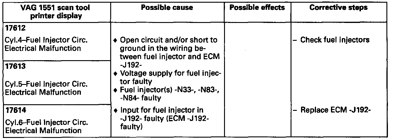 ^ If the malfunction "Cyl.X-Fuel Injector Circ. Electrical Malfunction"is stored for all six fuel injectors, the DTC "17908" is also stored.