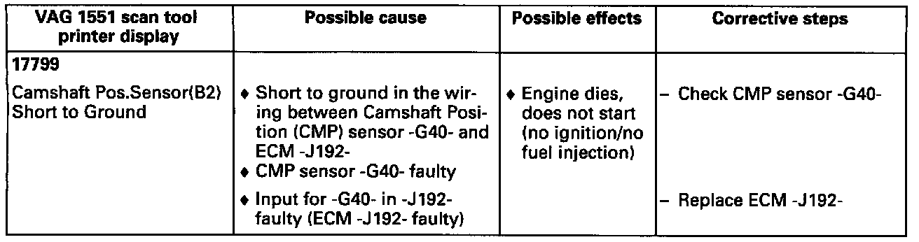 DTC "17799" is stored as soon as the CMP sensor signal is continuously "low" with an engine speed between 25 RPM and 2000 RPM and with more than three Crankshaft Position (CKP) sensor signals recognized.