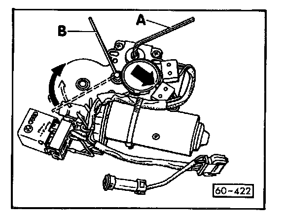 - Engage cable drive to sunroof motor by turning release lever -B- in direction opposite arrow.
