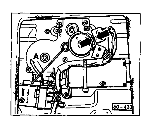 - Insert "crank" or hex key -A- (4 mm) into drive pinion, and turn to right until pin on switch latches into cam plate recess (arrow).