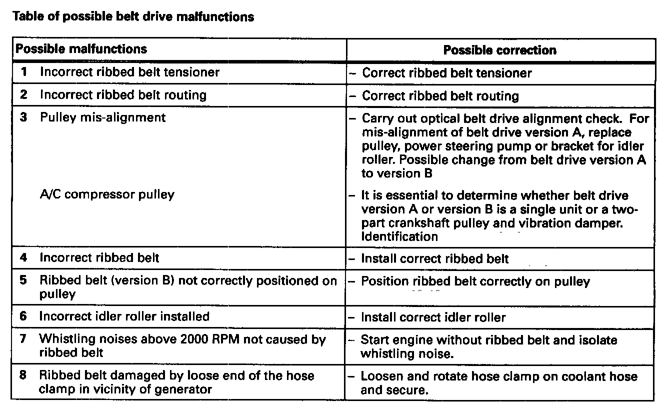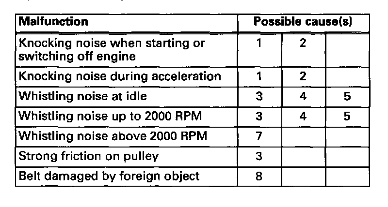 Ribbed belt drive, troubleshootingProceed as follows if ribbed belt drive noise is noted: