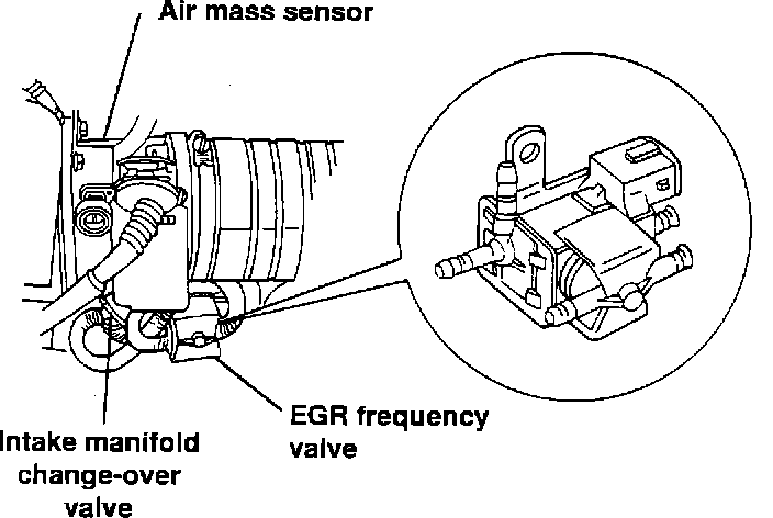 The EGR Vacuum Regulator Solenoid Valve is located at the rear of the air cleaner assembly, and is connected to the mass air flow sensor.