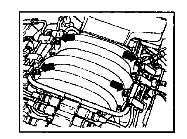 - Remove 4 screws (arrows) then lift engine cover brackets and fuel rail together with fuel injectors from intake manifold
