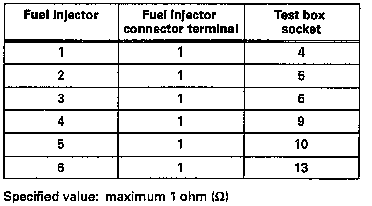 - Check control wire for continuity between fuel injector connector terminal 1 (in engine compartment) and test box.